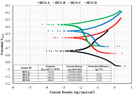 Investigation of the electrochemical corrosion properties by Tafel method was conducted to analyse the effect of generated layers on corrosion rate, as shown in Figure 5. To define improvement in corrosion resistance, lower icorr value and more positive Ecorr value toward noble side were required. Protection efficiency, ηPE values were calculated against HCS-A by the standard equation [22]. As consequences, the corrosion protection efficiency contributed around 18.35%, 51.96% and 35.44% on HCS-B, HCS-C, and HCS-D, respectively. The protective efficiency values were obtained against the base-material (HCS-A) or before heat-treated using wastes. HCS-C possessed the highest corrosion resistance as it has the thickest coating, leading to its highest improvement. Additionally, this improvement has direct effect on the presence of CrN and Mg3N2 in the ceramic layer, as they tend to have corrosion resistance nature. While, HCS-B has lowest protection, since its six-hour dwelling time, followed by HCS-D heat-treated at higher temperature, which was caused by volatilisation and gasification from most wastes, hence increased the decomposition rate that led to direct effect on diffusion rate and reduction reaction of metallic and oxide phases into steel substrate.