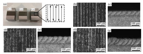 Morphology of bainitic steel after LSR. (a) Macroscopic overall morphology; (b–g) are the surface and cross-section micro-morphology of P-1 #, P-2 #, P-3 #, respectively.