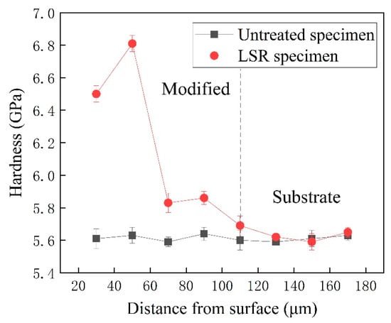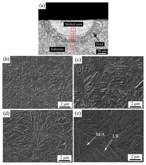 Taking the scanning speed of 50 mm/s as an example, the microstructures of the typical single-pass melted region were analyzed, as shown in Figure 5a. The energy distribution of the laser spot was uneven, with the center being high, the edge low, and the modified layer a crescent. Obviously, along the depth direction of the cross section, the laser modified layer can be divided into a complete transformation region and an incomplete transformation region; these are attributed to the fact that the temperature of melting zone is higher than Ac3 during laser processing, so the nucleation and growth of crystals occur in the matrix. The heat generated by laser melting transfers rapidly to the base metal and air, so rapid cooling is achieved. Specifically, in laser processing, the heating time and peak temperature of the surface are higher than the solid/liquid interface. Consequently, for the area near the surface, high energy intake leads to solid melting and then rapid cooling under the dual action of the air and the matrix, which is conducive to the formation of martensite. However, for the subsurface layer, the martensitic transformation in the cooling stage is not complete due to the relatively incomplete austenitization in the heating stage. For the laser melting process, the heating rate and peak temperature dynamics in the heating stage define the final microstructures. As shown in Figure 5b, the microstructure characteristics of martensite obtained by rapid heating and cooling can be observed, which is similar to the most widely accepted microstructure in bainite/martensite duplex steels. Figure 5c illustrates the transition form from uniform lath martensite without strip-like characteristics to acicular martensite. Figure 5d shows the structure of the heat affected zone (HAZ), where larger acicular martensite is obtained due to the higher temperature and longer residence time at the high temperature [,]. Figure 5e shows a matrix structure consisting mainly of lath bainite (LB) and a few martensite/austenite (M/A) islands [,]. The micrographs of the typical TEM of different regions of single-pass melting are shown in Figure 6. The ultra-thin martensite lath structure produced by rapid cooling at a distance of 50 μm from the surface is the main reason for the sharp increase of hardness. With the change of depth, the peak temperature of different irradiated regions is different, resulting in the obvious change of the substructure of martensite [,,]. It can be found in Figure 6c that the typical fine structure is dislocation. Whereas in Figure 6d, twinned martensite is observed. This is a typical selected area electron diffraction pattern of a {112} <111> twin with beam direction parallel to a [−113] α-martensite twin structure. A cross-section hardness gradient after single-pass LSR is plotted in Figure 7. It can be seen that the hardness of the modified layer is obviously higher than that of the matrix, and decreases as a whole from the surface to the inside. The maximum hardness value of 6.8 GPa appears at 50 μm away from the surface, where the microstructure is a fine martensite lath structure, and the change trend of hardness is consistent with the analysis results of the microstructure.