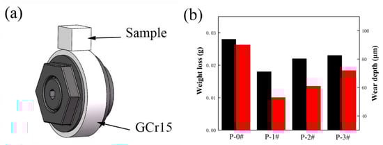 Wear of the modified layer with different laser scanning speeds. (a) Illustration of the wear contact mode of the ring-block; (b) Weight loss and wear depth after LSR.