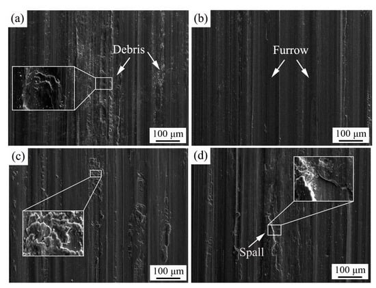 Figure 8a shows the wear pattern of the specimen. The samples before and after the wear test were weighed and the results are shown in Figure 8b. The wear weight loss and wear trace depth of the modified layer after LSR were lower than those of the matrix. When the scanning speed was 110 mm/s, the wear resistance of the bainitic steel surface after LSR was enhanced to the maximum, the wear trace depth was reduced by 47%, and wear weight loss was reduced by 55% compared with that of the untreated sample. Therefore, the LSR treatment of bainitic steel can significantly improve its surface wear resistance, and within a certain scanning speed range, the larger the scanning speed, the stronger the wear resistance of the melted surface. The wear surface morphology of the four groups of specimens was observed by SEM. It can be found that the wear surfaces of the four groups of specimens all present ditches and peeling. From Figure 9a, a large amount of debris is accumulated on the wear surface of the sample without LSR, and this debris peeling will greatly reduce the wear resistance of the surface. This is visualized in Figure 9c,d, in which the LSR can effectively improve the wear resistance of the specimens under the same sliding wear condition. With the increase of laser scanning speed, debris peeling decreases gradually. For the specimen with MPLSR in the friction process, the micro-convex body in the hardened layer is subjected to continuous cyclic shear stress, which results in fracture and the abjunction of the micro-convex body, leading to gradual formation of adhesive wear. However, in a certain range, with the increase of laser scanning speed, the transition of hard and soft microstructures in the modified layer gradually becomes continuous, which increases the wear resistance [].