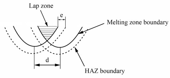 Scanning space is the main parameter affecting the performance and productivity of MPLSR. The influence of different scanning spaces on the melting layer was further studied. In order to determine the principle of selecting the scanning space, first, a simple model as shown in Figure 10 was established according to the macro-morphology of the cross section of the MPLSR specimen with a scanning speed of 50 mm/s. Figure 10 is a schematic diagram of the lap joint of melting by two lasers in which the solid line is the boundary of the molten pool, the dotted line is the boundary of the HAZ, and the shadow is the lap area. Two characteristic parameters were set, in which ‘d’ is the scanning space of two meltings and ‘e’ is the width of the HAZ.