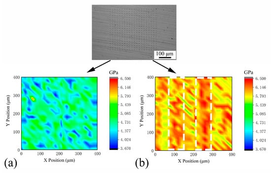 Distribution of the hardness values of the bainitic steel; (a) untreated specimen and (b) LSR specimen with d = 100 μm.