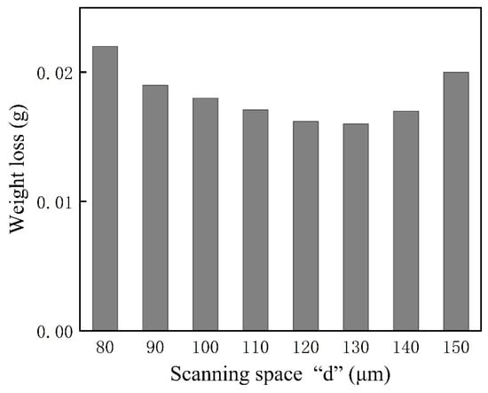 The lap zone is the overlap zone between the second and the first melting zones during LSR treatment, as shown in the shadow of Figure 10. Due to the effect of the second laser heating, the lap zone has a tempering-softening effect. The softening band caused by the lap may affect the wear resistance and service life of the material. The nanoindentation hardness test at 20 μm below the surface of the melting layer was conducted, and the indentation array results are shown in Figure 11. It can be seen that the varied range of the hardness of the overlap zone does not exceed 0.8 GPa, and the hardness of the MPLSR presents a high distribution alternating with a low distribution, which indicates that there is an obvious tempering-softening effect on the front pass from the back pass in the MPLSR treatment. From Figure 11, it can be seen that the hardness of the lap zone and laser melting zone is obviously higher than that of the parent metal, which suggests that the tempering-softening in lap zone is not serious. During melting, the second heating promotes part of the transformed first hardening structure to produce tempering-softening. In addition, because of the Gauss distribution of the laser spot energy, the temperature of the laser beam center decreases gradually from inside to outside, and the uneven heating of the overlap part inevitably results in a series of tempering transformations of different degrees, thus different hardness distributions are formed. As shown in Figure 12, it can be seen from the analysis of the wear test results that the wear resistance of the LSR specimens is improved with the increase of scanning space within a certain range. In the wear test, the friction test was performed on the surface of the melting sample in the form of a line contact and the frictional resistance was mainly borne by the hardened zone with high hardness. The higher the surface hardness is, the less abrasive it is, and better wear resistance it has. The softening zone connected with the hardening zone has the function of cushioning and unloading the force, which is conducive to improving the overall wear resistance. With the further increase of scanning space, the inhomogeneity of the microstructure and hardness of the modified layer also increase, which leads to worse wear resistance. Consequently, properly increasing the scanning space is conducive to improving wear resistance and production efficiency. Under the experimental conditions in this study, the suitable scanning space was 130 μm.