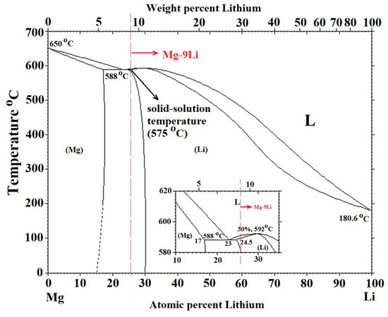 Duplex-phase Mg-Li alloys have been studied extensively among all the Mg-Li alloy series due to their outstanding comprehensive mechanical properties. However, their insufficient absolute strength still needs to be further improved [8,9]. Recent researches of Mg-Li alloys propose that alloying is a good choice to improve the mechanical property, such as alloying with Al, Zn, Y, RE, etc. [10,11,12,13]. Via proper alloying, the Mg-Li-x alloys can be further strengthened by grain-boundary strengthening with fine grains [14], dispersion strengthening with composited hard particles [15], and solid solution and aging strengthening via heat treatment [16,17]. However, alloying of the Mg-Li alloys will inevitably sacrifice the advantage of low density. Therefore, it is of great importance to improve the mechanical properties of binary Mg-Li alloys and achieve high service performance without any increase in density. Solid-solution (SS) treatment may be the potential way to improve the mechanical property of the binary Mg-Li alloys. According to the Mg-Li binary phase diagram (see Figure 1), only the duplex-phase binary Mg-Li alloys have the opportunity to drastically change the microstructure of both α-Mg phase and β-Li phase via the phase transition during the solid solution and quenching process [18]. Furthermore, the potential types of duplex-phase binary Mg-Li alloys are limited, only the alloys with a Li content from about 15 at.% to 17.8 at.%, and 24.5 at.% to 30 at.%, have the opportunity. In addition, the temperature range available for SS treatment of the duplex-phase Mg-Li alloy is also very limited, especially for the lower-density Mg-Li binary alloys with sufficient Li content, such as Mg-9 wt.% Li alloy (with a Li content of 25.7 at.%, usually named the Mg-9Li alloy). To those alloys, the SS treatment can only be conducted at a high temperature nearing melting-point temperature, which brings the potential risk of high-temperature oxidation and burnout due to the high chemical activity of Mg and Li atoms. Therefore, it will be a meaningful attempt to efficiently change the microstructure and improve the mechanical property of the binary Mg-Li alloys via SS treatment. As reported by M.V. Kral [19], the finer α-Mg phase will be newly precipitated via the phase transition during the quenching process, presenting the composited phase structure with the needle-like finer α-Mg phase, residual coarse α-Mg phase, and β-Li phase matrix of the Mg-8 wt.% Li alloy after SS treatment. With the greatly refined α-Mg phase, the SS-treated Mg-8 wt.% Li alloy may have an improved mechanical property due to the grain-boundary strengthening with a finer α-Mg phase grains and the increased α-Mg/β-Li phase interface.