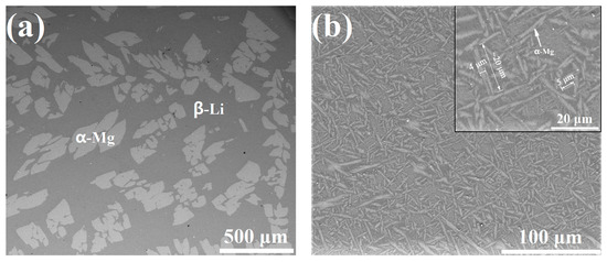 Figure 2 is the SEM microstructure of the Mg-9Li alloy before and after SS treatment. As seen in Figure 2a, the cast alloy presents the typical duplex-phase structure, including the bright lath phase and dark matrix phase. As has been widely reported [30,31], the lath phase in the Mg-Li duplex alloy is the Mg-enriched α phase (Mg-Li solid-solution phase) with a hcp structure, which is usually named as α-Mg phase briefly. The matrix phase of the Mg-Li duplex alloy is the Li-enriched β phase (Li-Mg solid-solution phase) with a bcc structure and is usually named as β-Li phase briefly. As reported by M.V. Kral and his collaborators [19], due to the intensive chemical activity of Li and Mg elements, the rapid bcc/hcp phase transition will occur to the single Li-Mg solid-solution phase (the high-temperature achieved phase during the heating process) during the quenching process, creating the newly precipitated needle-like α-Mg phase. In our study, the ice-water mixture was used as the quenching medium to improve the cooling rate. However, the decomposition of supersaturated solid solution and the phase-transition induced precipitation of new α-Mg phase was not stopped during the quenching. Figure 2b is the SEM microstructure of the as-quenched Mg-9Li alloy after SS treatment. Clearly, the phase morphologies were greatly modified, especially the α-Mg phase. The original coarse lath α-Mg phase has been completely changed into needle-like, fine α-Mg phase, no original coarse α-Mg phase was retained in the SS alloy. This phenomenon is obvious different to the SS-treated Mg-8Li alloy reported by M.V. Kral [19], which still contained a certain ration of residual coarse α-Mg phase. A great difference can be properly explained by the binary phase diagram of Mg-Li alloy, and the difference also indicates the satisfactory SS treatment efficiency of the Mg-9Li alloy. The magnified image in the right-up corner of the Figure 2b shows that the α-Mg phase has the crisscross feature and varying sizes. The large ones have sizes of 10~20 μm in length and 3~5 μm in width, while the smaller ones have sizes of about 5 μm in length and 1 μm in width.