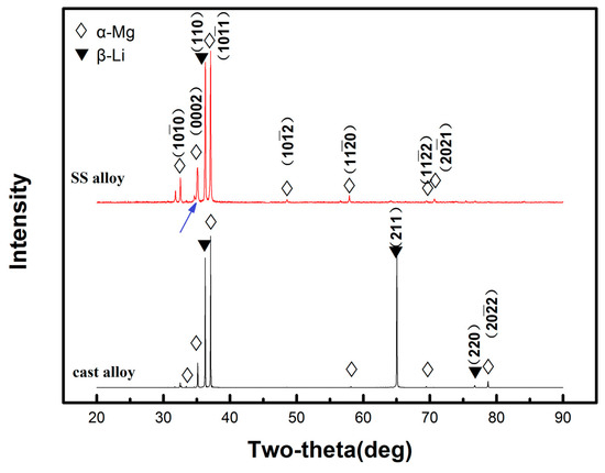 Figure 3 is the XRD patterns of the cast and SS Mg-9Li alloys. As marked in the patterns, the typical Mg peaks and Li peaks were detected in both the cast and SS alloys. Compared to the standard peaks, all the diffraction peaks of both α-Mg phase and β-Li phase occur slightly shifted due to their solid solution atoms. Another phenomenon to be emphasized is that the α-Mg phase peaks were strengthened while the β-Li phase peaks are weakened after SS treatment. Clearly, the (0002) basal plane, prismatic plane, pyramidal planes of the α-Mg phase were all strengthened. Meanwhile, β-Li phase peaks were significantly weakened and their (211) and (220) planes even disappear. As revealed in the SEM microstructure of Figure 2, the β-Li phase matrix of the SS alloy was been uniformly covered by the small needle-like α-Mg phase. One can deduce that the strengthening in α-Mg phase peak intensity and weakening in β-Li phase peak intensity may be induced by the improved coverage of the α-Mg phase on the β-Li phase matrix after SS treatment, which weakened the signal from the β-Li phase matrix. Another feature of the XRD pattern of the SS alloy that needs to be noted is the small protrusion on the left side of the (0002)α plane peak (as marked by the blue arrow). Hsu et al. considered this phenomenon was caused by the formation of a spin structure during the quenching process, which is believed to have a certain positive influence in improving the strength and hardness of the material [37,38].