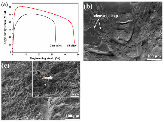 Engineering tensile strain-stress curves of Mg-9Li alloys (a) and SEM fracture morphologies of the cast alloy (b) and SS alloy (c).
