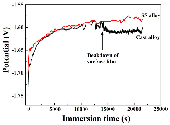 The obvious difference is that there was a sudden decrease in OCP value of the cast alloy after immersion for about 4 h, which should be induced by the localized breakdown of the surface film due to the aggression of chloride ions [56,57]. Meanwhile, the SS alloy kept a continuous slow increase in OCP value during the whole tested immersion period, indicating the superior stability of the surface film.