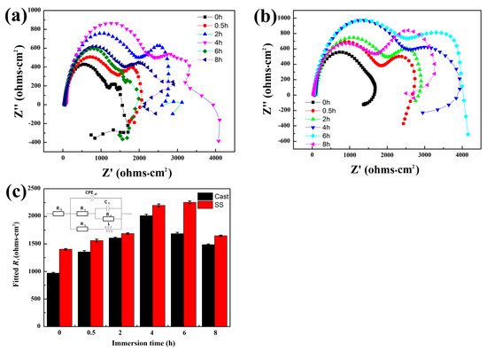 EIS is widely used in the investigation of electrochemical corrosion behavior of metallic materials, which has a great advantage in continuously monitoring the evolution of corrosion characteristic [58,59,60]. Figure 6a,b are the EIS Nyquist plots of the tested alloys obtained from the different immersion periods in the 0.1 mol/L NaCl solution. As seen in Figure 6, both alloys presented two capacitive arcs in the high and middle frequency and one inductive arc in the low frequency. The capacitive arc in the high frequency is the EIS signal from the substrate metal while the capacitive arc in the middle frequency reflects the signal from the interface of the surface film and the electrolyte [61]. Meanwhile, the appearance of the inductive arc usually indicates the initiation and propagation of pitting corrosion. The high-frequency capacitive arc of both alloys experienced an initial increase and then a further decrease with this phenomenon dominated by the competition between the thickening and the breakdown of the surface film. The transition period of the cast alloy was 4–6 h, which coincided with the evolution of OCP. For SS alloy, the transition period was prolonged to 6–8 h, which also evidenced the better stability of its surface film. Thirdly, during the whole tested immersion periods, the SS alloys always presented the larger capacitive arcs compared to the cast alloy, indicating its superior corrosion resistance of the surface film [62].