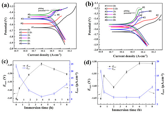 Potentio-dynamic polarization (PDP) curves and related parameters of the Mg-9Li alloys tested at different exposure time. (a,c) are the pdp curves and the evolution of Ecorr and Icorr values of the cast alloy. (b,d) are the pdp curves and the evolution of Ecorr and Icorr values of the cast alloy.
