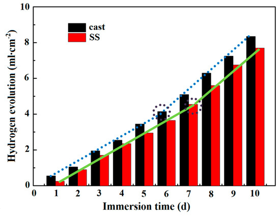 Figure 8 is the hydrogen evolution test of the cast and SS Mg-9Li alloys during the 10-day immersion in 0.1 mol/L of NaCl solution. As seen from Figure 8, the cast alloy had nearly double hydrogen evolution values compared with the SS alloy at the first day. With the increase of constant exposure time, both alloys presented a gradually increased hydrogen evolution rate. However, the SS alloy always had the obviously less hydrogen evolution rate than that of the cast alloy during each exposure period. As marked by the blue dotted line on the cast alloy and the green straight line on the SS alloy, both alloys had two stages of hydrogen evolution rates (i.e., the slopes of the dotted line and straight line), that both alloys experience a rapider hydrogen evolution rate after a transition period. The transition periods for the cast and SS alloys are six days and seven days, respectively. This is consistent with the results of the electrochemical test.