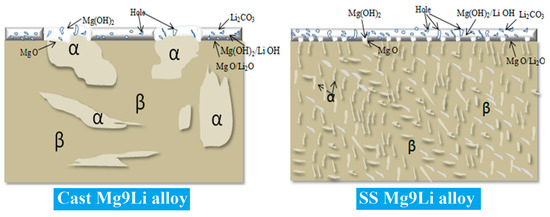 Illustration of surface film of the cast and SS Mg-9Li alloys.