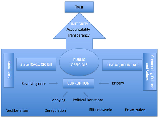 Figure 1 depicts factors influencing the behavior of public officials. The policies of deregulation, neoliberalism, privatization and the role of the country’s elite networks influence the level of corruption. Institutions, state Independent Commission Against Corruptions (ICACs), the CIC bill, the UN Convention Against Corruption (UNCAC), the Anti-Corruption Protocol of UNCAC (APUNCAC), and community culture and values influence the degree to which corruption impacts the behavior of public officials. These elements influence the degree of accountability, transparency, and integrity, which in turn influences the level of public trust in public officials and the government. In other words, the installation of strong institutions, state ICACs, a strong CIC bill, the UNCAC, and the APUNCAC embodies and bolsters community culture and values that reject corrupt practices; and reduces the influence of corruption, promotes accountability, integrity, and transparency; this in turn promotes public trust in government. Public officials—both elected (politicians) and appointed (civil servants; public servants or bureaucrats)—are the salient stakeholders in this ecosystem (Mitchell et al. 1997). The behavior of public officials is shaped by a sea of influences which ultimately shape public perceptions of the level of accountability, transparency, integrity and trust in the political system and the nation’s governing institutions.