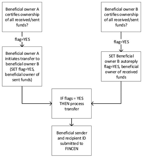 | 4 | APUNCAC offers each beneficial owner the option of pre-certifying beneficial ownership of all funds sent/received from the corresponding account. When a beneficial owner elects this option, an electronic autoreply flag would be set to “Yes, I certify beneficial ownership of all funds sent/received from my account”. This would permit electronic communication of this information when queried, eliminating delays that might otherwise occur when contacting the beneficial owner to request certification. A beneficial owner who chooses not to certify beneficial ownership of all funds sent/received from his/her account would need to reply to an electronic request for certification. This could be accomplished via a smartphone application, using digital certificate technology and password or 2-factor authentication. However, the point-of-sale transaction could proceed without delay, pending this reply, in the same way that credit card transactions proceed, and are ultimately posted, after all required digital communication is completed (usually within 24 h). If the beneficial owner desires the simplicity and speed of automated certification, he or she would need to elect automatic beneficial ownership certification of all funds sent/received from his/her account (See Figure 1). |