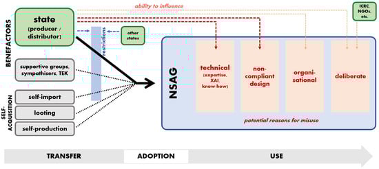 First, in the Transfer portion of the timeline, we found that States—both producers and distributors—are the most likely provider, with the other sources being limited in their ability to provide this type of technology to insurgent groups. As the systems are being transported to the NSAG, it is likely that a majority of them will be relatively vulnerable to what we shall call ‘restrictions’—any measures that limit or block the delivery of the weapons to the NSAG, such as weapons-control treaties and embargoes (; )—due to their relative visibility compared to weapons such as small firearms. Turning then to the Use phase, we determined four general factors which may lead to their misuse: deliberate violations, violation-conducive environments, the uncritical use of weapons whose designs are not LOAC-compliant, and technical difficulties related to modern AI which require expertise to navigate and to which NSAGs likely will not have access.