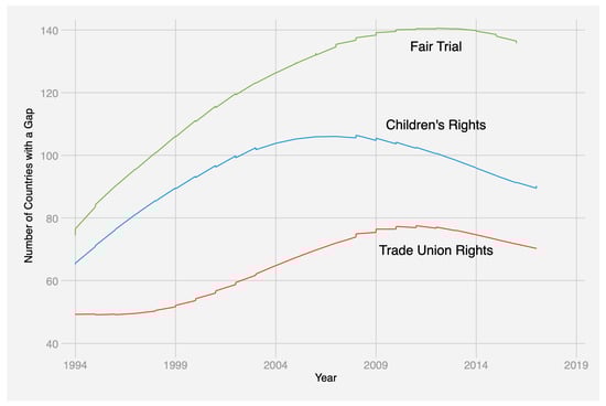 As was previously shown in Table 2, the likelihood of a domestic compliance gap was greatest for the right to a fair trial and the smallest for the right to form trade unions throughout the entire 1981–2016 period of this study. One reason for the greater likelihood of a compliance gap for the right to a fair trial than for other rights for all years may be that, as shown in Table 1 above, domestic fair trial promises, on average, were stronger. Keeping strong promises is harder than keeping moderate ones. However, other factors must play an important role. As was shown in Table 1, more states promised full protection of trade union rights than children’s rights, but gaps were more likely for children’s rights anyway.