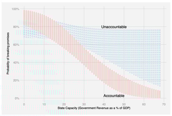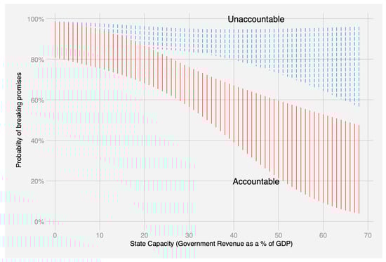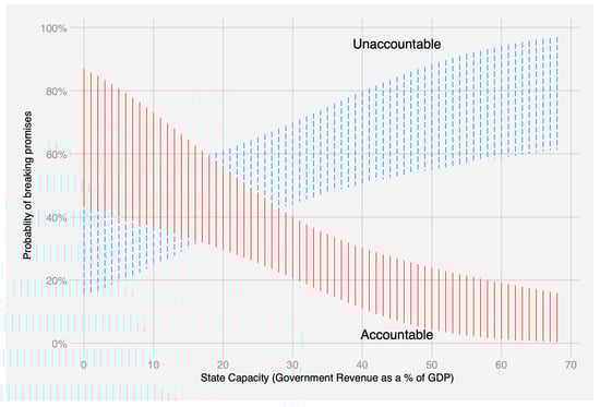 Figure 2, Figure 3 and Figure 4 show that different combinations of accountability and capacity produced different probabilities of gaps for each of the three rights. Unaccountable, autocratic states such as China and Russia were less likely to break their domestic promises to protect children’s rights, were more likely to break their domestic promises to protect union rights and were neither more nor less likely to break their domestic promises to protect the right to a fair trial. This suggests that the role of state capacity in autocratic states varies by the type of rights, sometimes leading to more promise-keeping and at other times leading to more broken promises. For all models, high capacity, accountable states had the highest likelihood of keeping promises, consistent with findings in the literature.