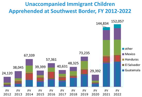 Number of unaccompanied children apprehended at the Southwest Border from 2012–22. (Source: U.S. Customs and Border Protection: Southwest Land Border Encounters; https://www.cbp.gov/newsroom/stats/southwest-land-border-encounters, accessed on 30 December 2022).