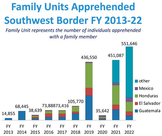 Number of individuals apprehended in family units at the Southwest Border from 2013–21. (Source: U.S. Customs and Border Protection: Southwest Land Border Encounters; https://www.cbp.gov/newsroom/stats/southwest-land-border-encounters, accessed on 30 December 2022).