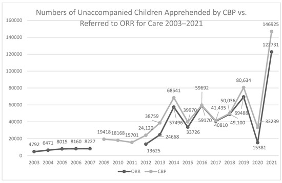 The number of unaccompanied children (UC) arriving at the southern border of the US has risen drastically since the early 2000s, with 146,925 UC apprehended in 2021, after some fluctuations over the past five years (CBP 2022). Figure 1 below shows this trend as illustrated by the number of UC referred to the Office of Refugee Resettlement (ORR) for physical care and legal custody between 2004 and 2007 (Congressional Research Service 2009), as well as the number of UC apprehended at the Southwest Border from 2009 to 2021 (CBP 2016, 2017, 2018, 2019, 2022) and the numbers of UC referred to the ORR for placement in 2012–2021 (ORR 2019, 2022a). In each of these years, it is expected that the number of UC apprehended at the border is slightly higher than the number of those referred to ORR custody, as some youth are subject to “voluntary removal” after screening at the border as part of the special policies for children from contiguous countries (Mexico and Canada) as set out by H.R. 7311 sec. 235. For example, in 2018, there were 50,036 unaccompanied children apprehended at the border (CBP 2018) yet only 49,100 of these UC entered ORR care and custody (ORR 2019). The number of unaccompanied minors apprehended by CBP in 2020 was strikingly low due to the COVID-19 pandemic, with only 33,239 apprehensions at the border and 15,381 UC referred to the ORR (CBP 2022; ORR 2022a). However, in 2021 the number of UC is the highest yet, with 146,925 UC apprehended by CBP and 122,731 referred to the ORR (CBP 2022; ORR 2022a), showing an increased need to continue research on this group of vulnerable children.