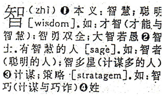 Thus, in a Chinese character dictionary (Figure 2), in which the most important character meanings are also given in English, the character for “wisdom”, zhi 智, is explained as follows: