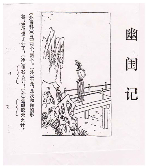 In the drama Report on a Lonely Woman’s Chamber (see Figure 3) by Shi Hui from the Yuan Dynasty (1271–1368), the war cloak of the persecuted son of a high dignitary who has just been killed by imperial order lies next to a well shaft. The two captors initially think that the son had thrown himself into the well and thus taken his life. Then, one of the captors says: “We’ve been taken in by a stratagem.”—“Which stratagem?”—“The stratagem «The cicada casts off of its skin of gleaming gold». He tricked us into looking for his body here. In the meantime, he’s long gone” (Sheng 2006).