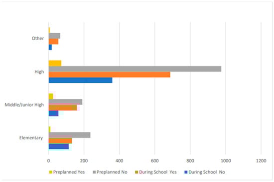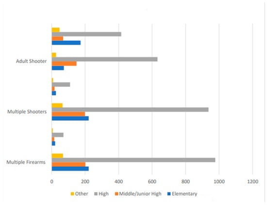 Figure 1 illustrates that school shootings involving handguns disproportionately occur at high schools, n = 894 (67.8%), followed by elementary, n = 196 (14.9%), junior high/middle, n = 172 (13.1%), and other, n = 56 (4.2%). School shootings involving shotguns mostly occur at high schools, n = 33 (67.3%), followed by junior high/middle, n = 8 (16.3%), and elementary and other, n = 4 (8.2%). School shootings involving rifles mostly occur at high schools, n = 41 (50%), followed by junior high/middle, n = 19 (23.2%), elementary, n = 16 (19.5%), and other, n = 6 (7.3%). School shootings involving a combination of different weapons mostly occur at high schools, n = 24 (58.5%), followed by junior high/middle, n = 8 (19.5%), elementary, n = 6 (14.6%), and other, n = 3 (7.3%). Figure 2 illustrates that school shootings involving multiple firearms mostly occurred at high schools, n = 70 (62.5%), followed by elementary, n = 21 (18.8%), junior high/middle, n = 15 (13.4%), and other, n = 6 (5.4%). Figure 2 illustrates that school shootings involving multiple shooters mostly occurred at high schools, n = 110 (68.8%), followed by elementary, n = 25 (15.6%), junior high/middle, n = 17 (10.6%), and other, n = 8 (5%). Figure 2 illustrates that school shootings involving adult shooters mostly occurred at high schools, n = 415 (59%), followed by elementary, n = 173 (24.6%), junior high/middle, n = 68 (9.7%), and other, n = 47 (6.7%). Figure 3 illustrates that school shootings that occurred during school hours mostly occurred at high schools, n = 687 (66.4%), followed by junior high/middle, n = 160 (15.5%), elementary, n = 132 (12.8%), and other, n = 55 (5.3%). Figure 3 illustrates that school shootings that were pre-planned mostly occurred at high schools, n = 72 (63.2%), followed by junior high/middle, n = 25 (21.9%), elementary, n = 10 (8.8%), and other, n = 7 (6.1%).