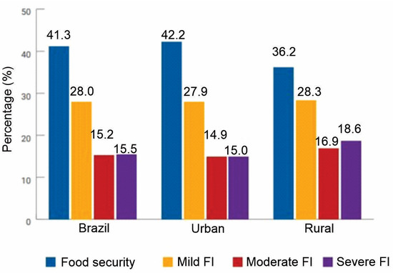 Considering the households that participated in the survey, the results show that 41.3% of them were in a food security situation, and 28% faced uncertainty regarding access to food and had compromised food quality. Food insecurity was verified in 30.1% of households, of which 15.5% were facing hunger, with severe food insecurity (Figure 2). Furthermore, it is relevant to highlight that levels of food insecurity are higher in rural areas, compared to urban areas, as shown in Figure 2 (PENSSAN Network 2022).