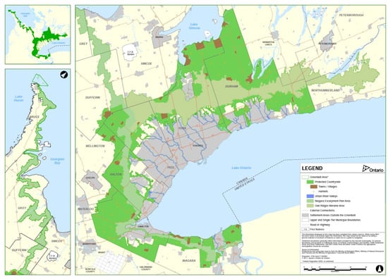 17 | Section 2 of the Green Belt Act 2005. Available online: https://www.ontario.ca/laws/statute/s05001 (accessed on 18 May 2023). |