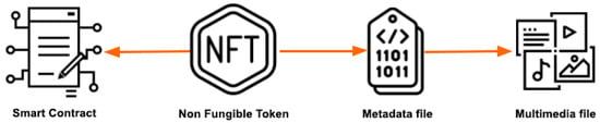 In summary, the creation of an NFT for a digital artwork followed these stages: First, a smart contract with predefined functionalities was developed. Second, the smart contract was deployed on the blockchain. Third, the metadata file of the artwork was created and stored, along with the multimedia file, in a decentralized storage system. Finally, the NFT was minted by executing the smart contract. Both are closely linked, as the smart contract defines the NFT’s functionalities. Figure 2 shows the elements associated with the NFT.