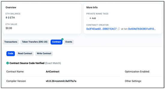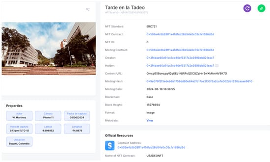 Once the NFT was minted, its creation could be validated on the blockchain16 through the contract address and its unique identifier (ID), as seen in Figure 6.