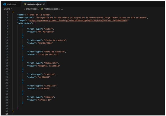 The second item associated with an NFT is the metadata file. With the contract deployed, the NFT could start being minted, but as previously mentioned, it is essential to have a metadata file that serves as a bridge between the NFT and the multimedia file (image and video) representing the asset, as it allows for its unequivocal identification. This metadata file contains descriptive and locational data of the asset, among other things. Below are the data and metadata used to describe the digital asset, which, in this case, is a photograph: