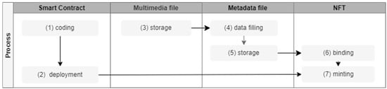 As seen in Figure 2, creating the NFT required a smart contract, the metadata file, the NFT, and the multimedia file. Each of these components is detailed here further.