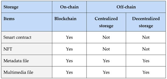 In on-chain storage, the NFT’s metadata and multimedia file are directly recorded on the blockchain. The file’s integrity and availability are guaranteed as long as the underlying blockchain network remains intact and accessible. In this case, the work or asset is directly linked to the token, eliminating uncertainties about the removal or limitation of the use of the asset hosted off-chain since the digital element can continue to exist even if the original company no longer does (). The main drawback of this storage type is the high minting transaction costs, which currently discourage its use. Therefore, it is more common to store only the image metadata on the blockchain (Janesh s/o Rajkumar v Unknown person, 2022).