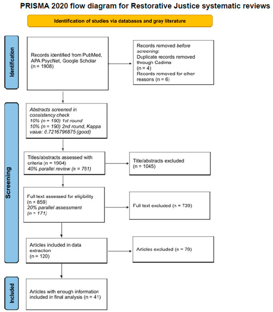 Data were extracted from 120 articles in order to screen for the final inclusion criteria, requiring sufficient information on an alternative incarceration model for potential replication. To be considered sufficient, data were needed in the following areas: intervention components, restorative justice components (i.e., as outlined by the aforementioned definitions of RJ), physical design elements, partnering agencies, and information on findings. A total of 41 articles met this criteria and were then combined into eight categories of analysis (see Table S1 for a table of studies and Table S2 for intervention details on FigShare—to be added). We followed the PRISMA 2020 guidelines but opted not to register the study.
