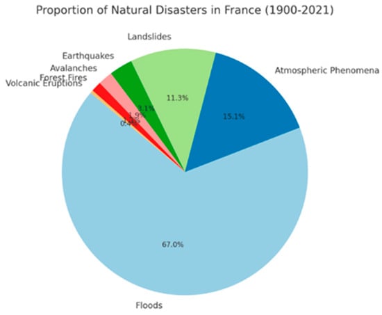 Floods account for the majority of natural disasters in France (67%), followed by atmospheric phenomena (15.1%) and landslides (11.3%). Earthquakes, avalanches, wildfires, and volcanic eruptions, though less frequent (<7%), can cause significant localized impacts (Figure 2). This chart highlights the importance of managing risks related to climate change and vulnerable infrastructure.
