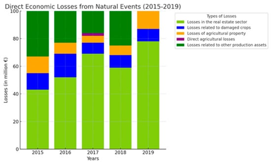 The following chart shows the evolution of direct economic losses caused by natural events in France between 2015 and 2019. Losses in the real estate sector dominated each year, accounting for between 43% and 78% of the total, reflecting the impact of disasters on urban and residential infrastructure. Losses related to damaged crops and agricultural assets varied but remained significant, highlighting the agricultural sector’s vulnerability to extreme climatic events (Figure 3). Other productive assets sustained lower but still noteworthy losses. The year 2017 stands out with particularly high losses reaching a peak, likely due to major events that year. This chart underscores the need to strengthen the resilience of infrastructure and agricultural systems in the face of increasing natural risks.
