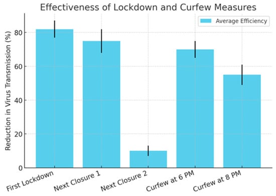 According to the results of a study conducted by researchers () (Figure 4) which considered infection rates and patient age groups, the first lockdown reduced virus transmission by 84%. Subsequent lockdowns were less effective, with reductions of 74% (69–77) and 11% (9–18), respectively. A 6 p.m. curfew proved more effective than an 8 p.m. curfew, reducing transmission by 68% (66–69) compared to 48% (45–49).