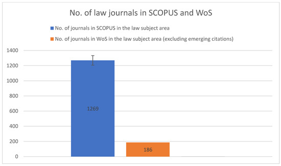 Both WoS and Scopus websites have a search engine that enables searching for journals by subject area. The overall number of journals for the law subject area in WoS as per 1 February 2025 (excluding emerging citation collection) was 186, and for Scopus it was 1269 (the number of 1269 in Scopus includes book series). The difference between these numbers alone is telling (Figure 1). In the next step, journals were selected based on the criteria set above.