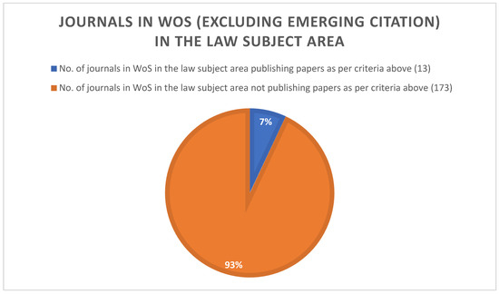 When we focus on the WoS, we see that out of 186 journals listed in WoS in the law subject area (excluding emerging citation), only 13 publish papers as per the criteria above (Figure 2).