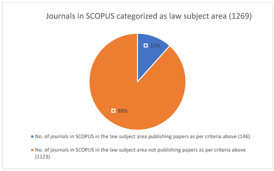 While the number of journals in Scopus that fit the set criteria, with 146, seems much better than in WoS, it is still only 12% of the overall number of journals that fall within the law subject area (Figure 4).
