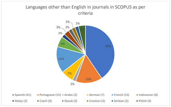 To understand the results correctly, one needs to consider that the 67 journals that allow publications in languages other than English often allow multiple other languages. That is why the number of journals per language is higher (101) than the overall number of journals allowing publications in languages other than English.
