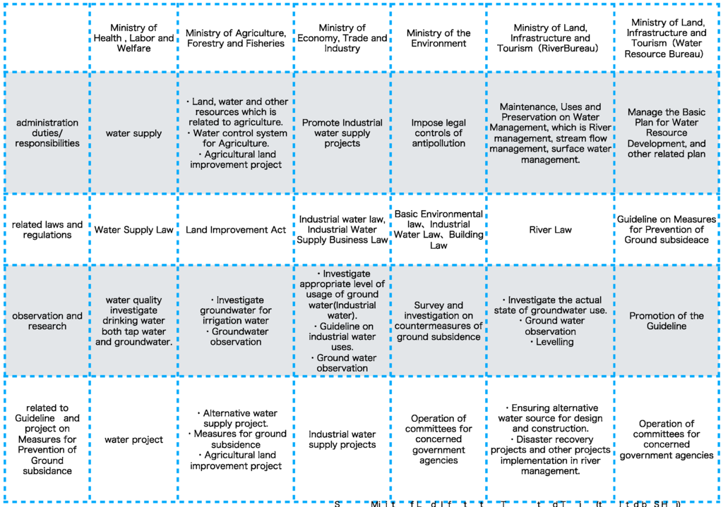 The complex legal systems have been discussed to understand the limitations of Japanese groundwater policy. Groundwater law is referred to as a “nested groundwater legal structure”, or an “overlapping legal structure”. Those laws are complementary to each other [