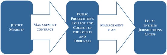 In order to achieve these ambitious objectives, the Justice Minister, (supported by parliament which would vote on the law), taking inspiration from the suggestions of her predecessor, created an entirely new judicial architecture, and envisioned an unprecedented sharing of management skills. New bodies were therefore created in the form of the Public Prosecutor’s College13 and the College of the Courts and Tribunals14 (Piraux 2017). These would be responsible for the distribution of resources between the local Judicial bodies that they would establish with the approval of the Justice Minister. These local entities would therefore autonomously manage their resources, in keeping with the management plans they would agree with the new bodies (see Figure 1).