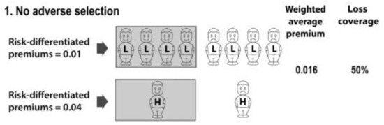 The weighted average of the premiums paid is (4 × 0.01 + 1 × 0.04)/5 = 0.016. Since higher and lower risks are insured in the same proportions as they exist in the population, there is no adverse selection. Exactly half of the population’s expected losses are compensated by insurance. I describe this as ‘loss coverage’ of 50%. The calculation is: