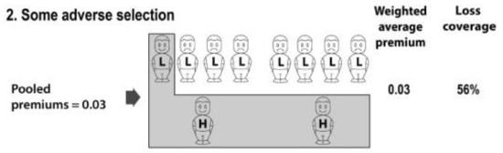 Note that, in Scenario 2, purchasing is skewed towards higher risks, the weighted average premium is higher, and the number of risks insured is lower. This triad comprises the essential features of adverse selection, which Scenario 2 accurately and completely represents. However, there is a surprise: despite the adverse selection in Scenario 2, the expected losses compensated by insurance for the whole population are now higher. That is, 56% of the population’s expected losses are now compensated by insurance, compared with 50% before. The calculation is: