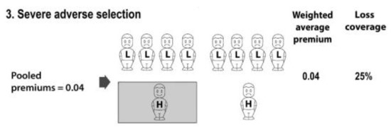 In Figure 3, adverse selection has progressed to the point where only one higher risk, and no lower risks, buys insurance. The expected losses compensated by insurance for the whole population are now lower. That is, 25% of the population’s expected losses are now compensated by insurance, compared with 50% in Scenario 1, and 56% in Scenario 2. The calculation is: