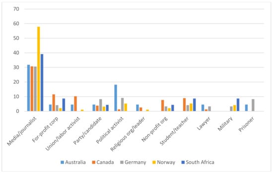 Percent FoE Decisions by Speech Claimant Type across Five National High Courts. Note: All known constitutional FoE holdings issued by High Court of Australia (N = 22), Supreme Court of Canada (N = 78), Federal Constitutional Court of Germany (Senate holdings only, not Chambers; N = 143), Supreme Court of Norway (N=95), and Constitutional Court of South Africa (N = 23). For-profit corp excludes media corporations. Political activist excludes labor and partisan actors. Non-profit org excludes labor, partisan, and religious orgs. Student/teacher includes writers and artists as well.