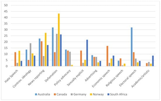 Together with an international team of collaborators, I am currently collecting systematic data on the full universe of constitutional free expression decisions issued by a range of national, transnational, and subnational courts worldwide. The data in our Global Free Speech Repository (GFSR) will include many familiar features of existing judicial decisions datasets (such as the U.S. Supreme Court Judicial Database), but with more nuanced characterizations of the identity of the speech claimants in each case and the content and physical form of their speech acts. Drawing on preliminary project data, Figure 1 and Figure 2 illustrate the distribution of speech claimants and speech content categories in cases from five national high courts.9 As Figure 1 makes clear, the modal free expression claimant across jurisdictions is a journalist, but all five high courts hear cases filed by a range of other claimants as well. Twelve percent of the Canadian cases were filed by for-profit corporations (excluding media companies), and 18 percent of the Australian cases were filed by political activists. As Table 2 indicates, the expressive content of the speech act at issue most commonly consists of news reporting and/or (alleged) defamation, although in Australia, electoral speech is on par with defamation (each representing 32 percent of the sample). This latter finding is surely due to the fact that when the Australian High Court held that the Australian Constitution includes an implied guarantee of free expression, it expressly limited this right to political communication.10 As such, we see comparatively few Australian cases involving hate speech, sexually explicit speech, economic speech, and academic/artistic speech.
